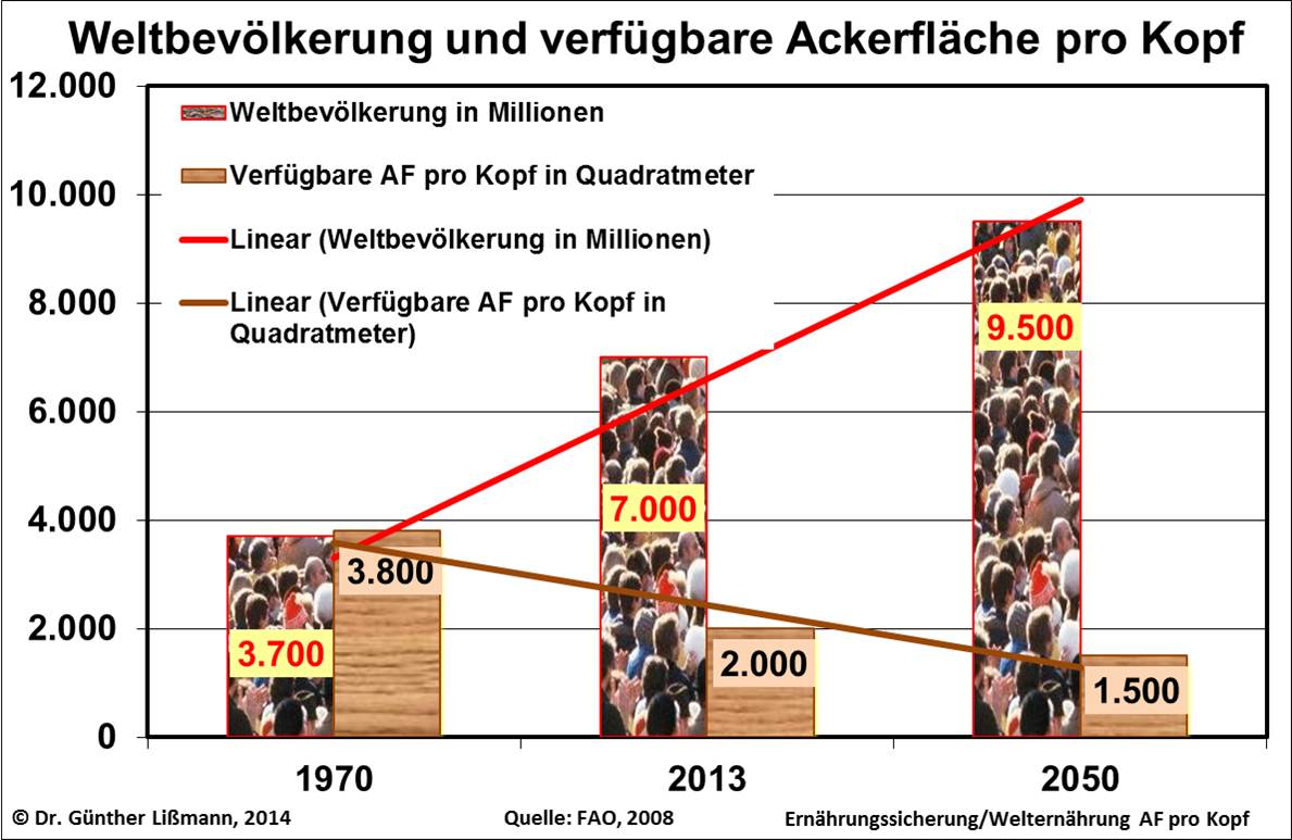 Die verfügbare Ackerfläche (AF) liegt heute weltweit nur noch bei 0,20 ha pro Person. Bei dem prognostizierten Bevölkerungswachstum bis zum Jahre 2050 werden pro Person nur noch 0,15 ha AF zur Verfügung stehen. Die Europäische Union (EU) mit 27 Mitgliedsstaaten verfügt über einen hohen Ackerflächenanteil und weltweit über die besten Agrarstandorte, aber auch hier entfallen auf jeden Einwohner nur 0,20 ha AF, mit fortgesetzt fallender Tendenz Weder in Deutschland noch in der EU wird eine Selbstversorgung mit Nahrungsmitteln erreicht. Unter Berücksichtigung der Importe und Exporte von Nahrungs- und Futtermitteln, kommt Deutschland auf eine SV von 89 %. Schätzungen gehen davon aus, dass für die gesamte EU Nahrungs- und Futtermittel sowie Naturfasern und Bioenergie in einem Flächenumfang von 20 bis 30 Millionen ha außerhalb der EU beansprucht werden. Das ist Landraub zum Nachteil der armen Länder. Neben dem Klimawandel frisst der Wohlstand zunehmend das beste Agrarland, durch die massive Ausdehnung der Siedlungs-, Verkehrs- und Freizeitflächen. Das trifft insbesondere für die Schwellenländer zu, aber bedauerlicherweise auch für wohlhabende Länder wie beispielsweise Deutschland und die USA.