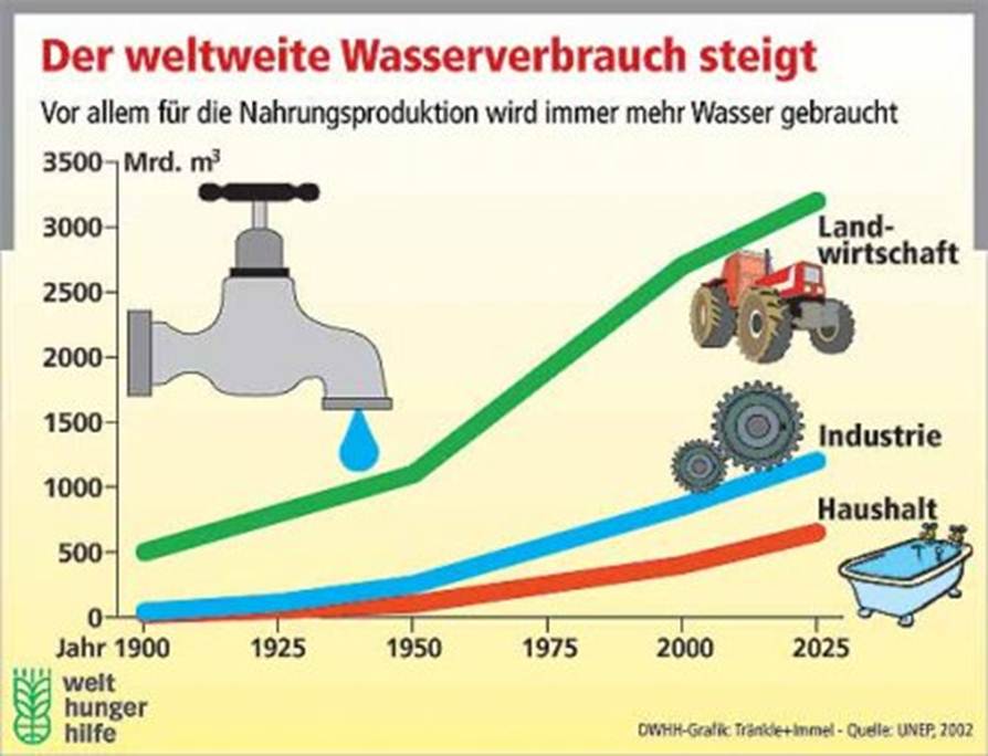 Die Urbanisierung nimmt zu. Schon jetzt leben über 50% der Weltbevölkerung in Städten und die Tendenz ist weiter steigend. Die Wasserknappheit führt schon seit einigen Jahren zu Auseinandersetzungen zwischen Landwirtschaft und Stadtbevölkerung sowie zwischen einzelnen Staaten.