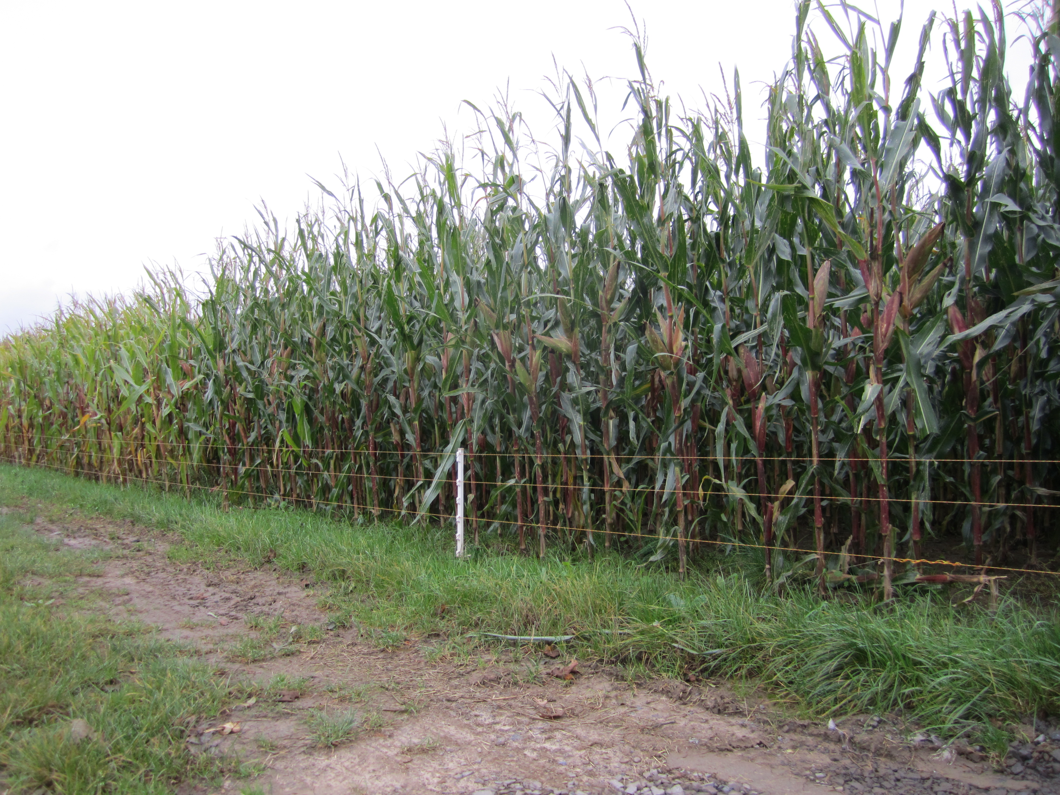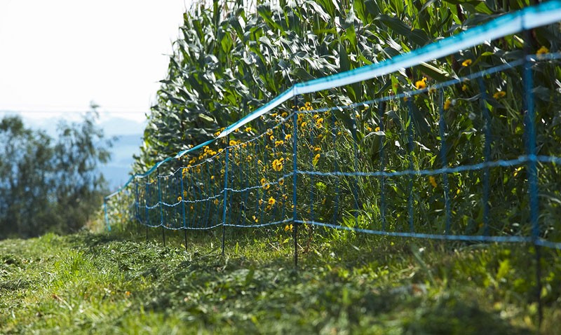 Insbesondere für Mais, nach der Aussaat und ab der Milchreife, ist ein guter und fachkundig aufgestellter Elektrozaun eine zuverlässige Wildschadensabwehr. Voraussetzung ist ein hochwertiges und leistungsfähiges Weidezaungerät. Für längere Zäune im Dauerbetrieb sind 12-Volt-Akkugeräte zu empfehlen. Zur Wildschadensabwehr sollte die Spannung in allen Bereichen des Zaunes mindestens 4.000 Volt, besser 8.000 Volt betragen. Als Zaunpfähle haben sich Kunststoffpfähle bewährt, welche sich leicht transportieren lassen und einen schnellen Aufbau ermöglichen. Der Pfahlabstand sollte 6 m nicht überschreiten. Für die Ecken sollten dicke Holz- oder spezielle Kunststoffpfähle, die sich nach dem spannen des Zaunes nicht schief ziehen, verwendet werden. Gerade an den Ecken müssen die Pfähle gut verankert sein, damit die Zaunspannung erhalten bleibt. Für die Bespannung sind zwei, besser drei Drähte erforderlich. Die Drähte/Litzen sollten auf etwa 20, 50 und 80 cm angebracht werden. Bewährt haben sich Kunststofflitzen mit 1 cm Breite. Der Zaum ist dann für Wild gut sichtbar und verhindert sowohl eine Unterquerung als auch ein Überspringen. Alle 50 m werden die Litzen miteinander verbunden um einen gleichmäßigen Stromfluss zu gewähren. Voraussetzung für die dauerhafte Funktionstüchtigkeit ist eine regelmäßige Kontrolle und das Freihalten des Zaunes vor Bewuchs. Hier können mechanische Geräte oder auch zugelassene Herbizide zum Einsatz kommen.