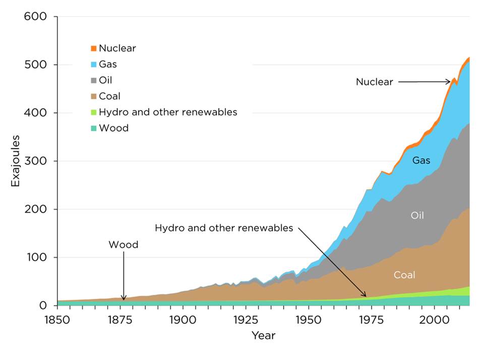 Die fossilen Energieträger Kohle, Erdöl sowie später auch Erdgas waren preiswert zu haben, es entstanden nur Förder- und Bereitstellungskosten. Der gewaltige Aufschwung bei Güterproduktion und Verkehr, zunächst in den Industriestaaten und später auch darüber hinaus, wurde fast ausschließlich durch die beliebige Verfügbarkeit der fossilen Energie möglich. Der problemlose Zugang zu Elektrizität und Treibstoff hatte auch eine gigantische Technisierung in den privaten Haushalten zur Folge. Heizung, Kühlung, Beleuchtung, TV und Telekommunikation sowie Individualverkehr haben auch die Privaten Haushalte zu Energiegroßverbrauchern werden lassen. Verursacht durch die Technisierung im Produktions- und Privatbereich, insbesondere seit den 50er Jahren, wuchs der Energieverbrauch exponentiell. Die Übersicht 1 zeigt den Weltenergieverbrauch in der Zeitspanne zwischen 1850 und 2015.